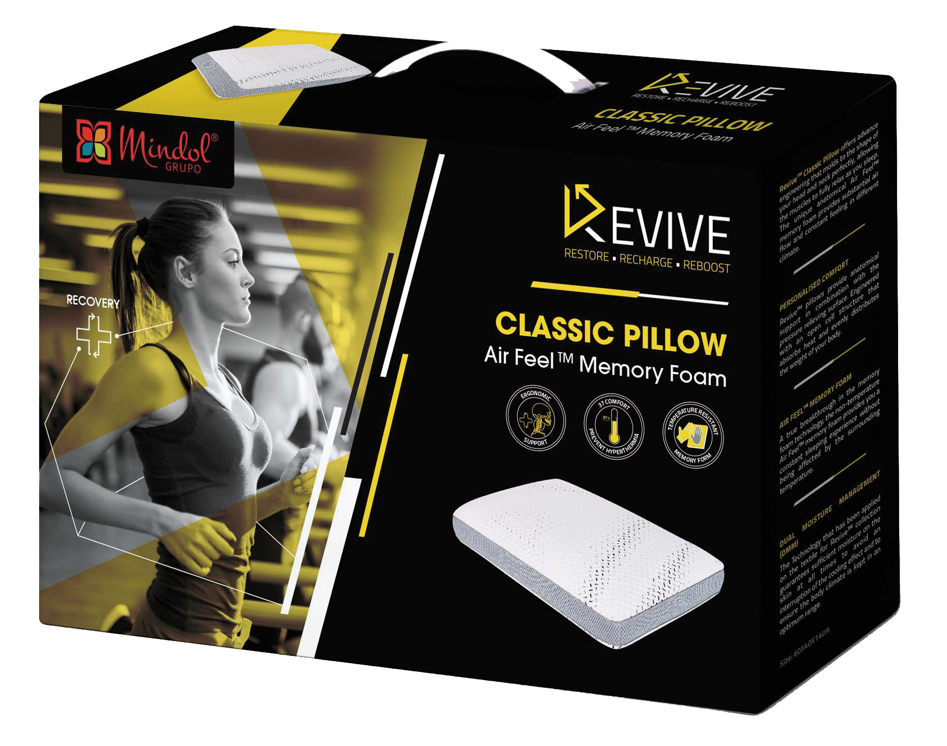 A recuperação fisica após um treino é muito importante para permitir a recuperação muscular e corporal e repor a energia. A viscoelástica Revive foi projetada para indivíduos com um estilo de vida ativo, priori-«zando o alívio dos pontos de pressão e para ajudar na recuperação fisica e no alívio de dores causadas pelo exercicio fisico. A viscoelástica Revive suporta o seu corpo e reage às forças de maneira diferente da viscoelástica tradicional, deformando-se em três direções. Com a viscoelástica patenteada Air Feel, não sensível à temperatura, as almofadas Revive proporcionam uma experiência de sono confortável e constante sob temperaturas ambiente diferentes.