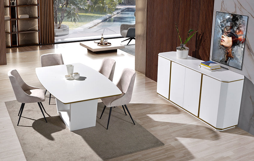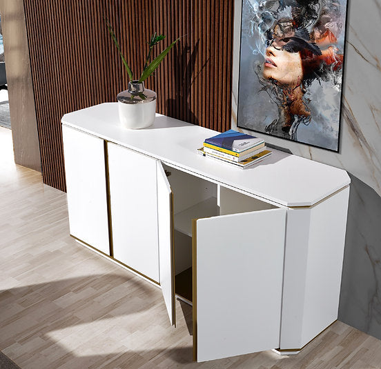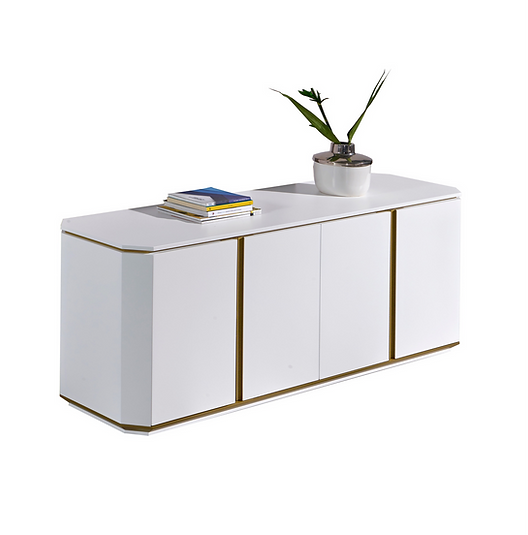 Com um design minimalista e contemporâneo, este aparador combina perfeitamente forma e função para criar um visual limpo e organizado em qualquer espaço. O acabamento do aparador é em Mate Branco e Dourado.