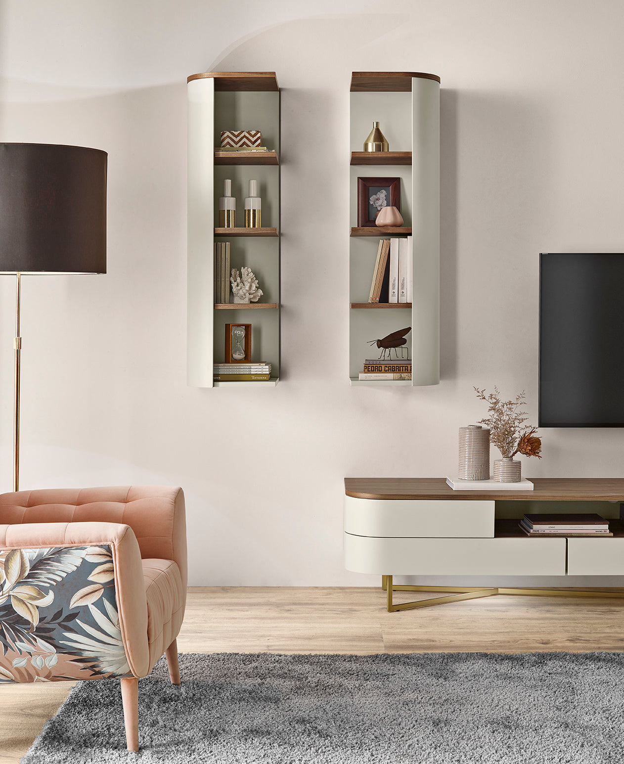 1 Armários Suspensos verticais com acabamento na estrutura em Lacado Mate (LM20) e o tampo mais as prateleiras em folha de Nogueira (NG).