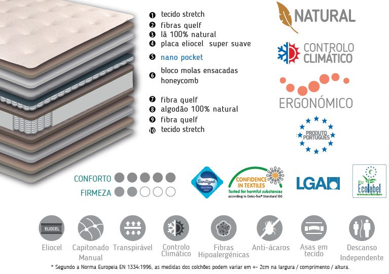 Nano Pocket - Com a camada de nano pocket na parte superior do bloco, maximizamos as excelentes propriedades da estrutura de molas principal, alcançando o máximo conforto e uma adaptabili-dade extrema a cada ponto do corpo.