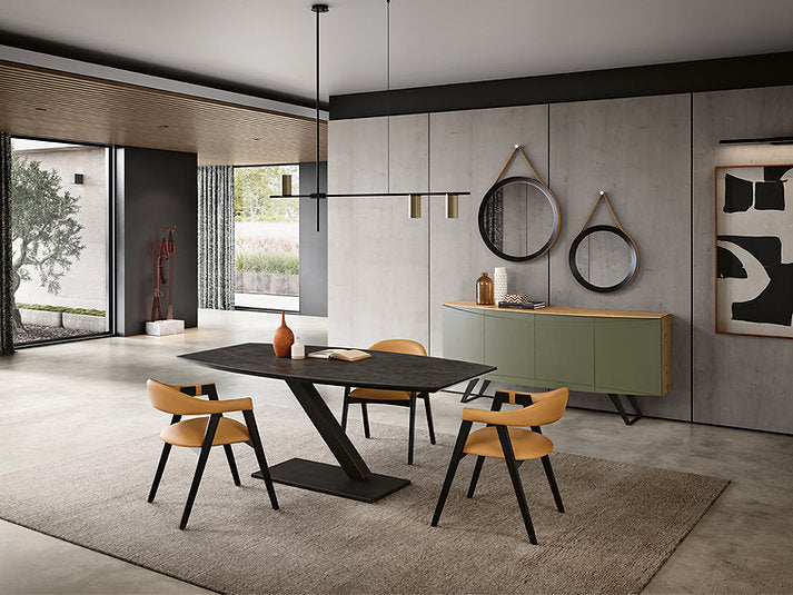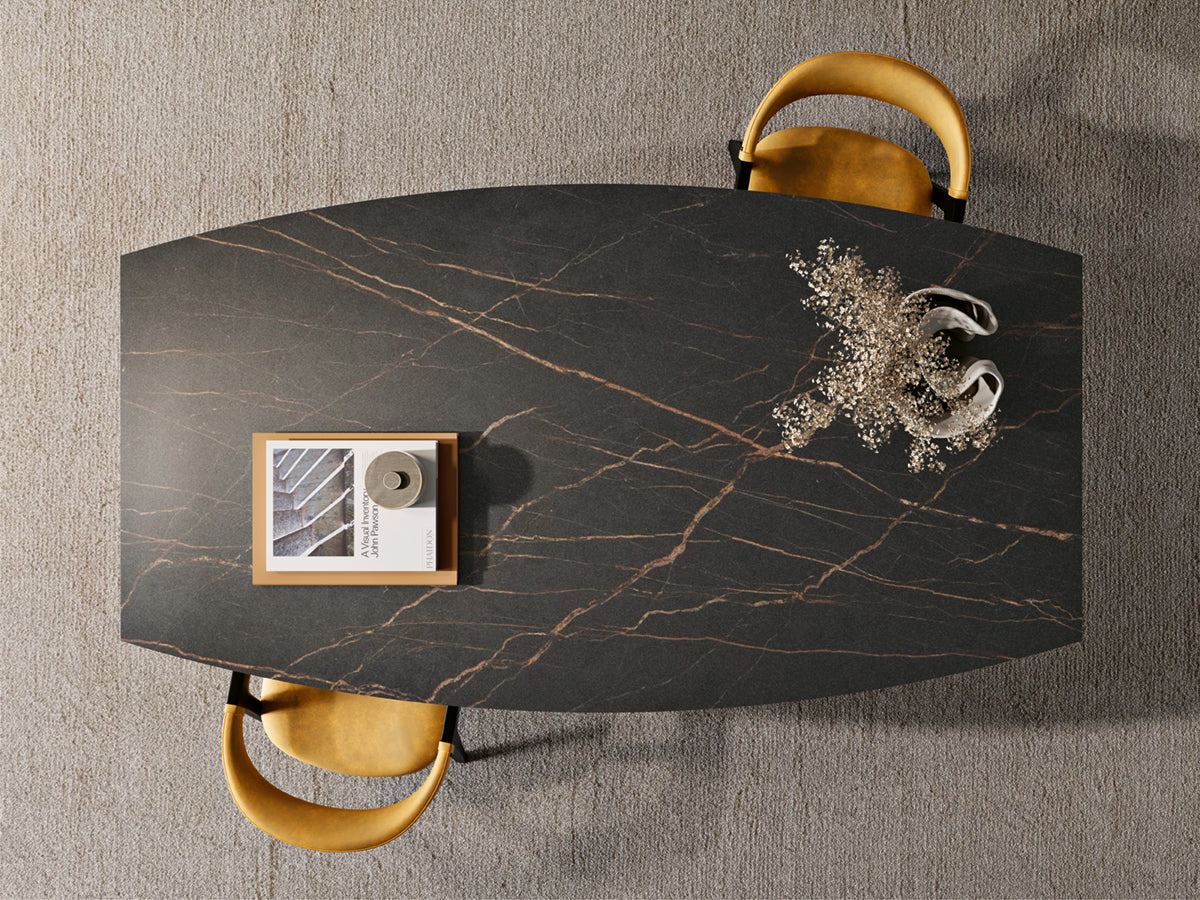 Mesa de Jantar elegante, inspirada num design simples, torna-a numa peça de mobiliário verdadeiramente universal, que funciona bem em ambientes modernos e minimalistas. O tampo da mesa é ovalizado e fixo, está em Lacado Mate com Cerâmica e pé em Ferro.