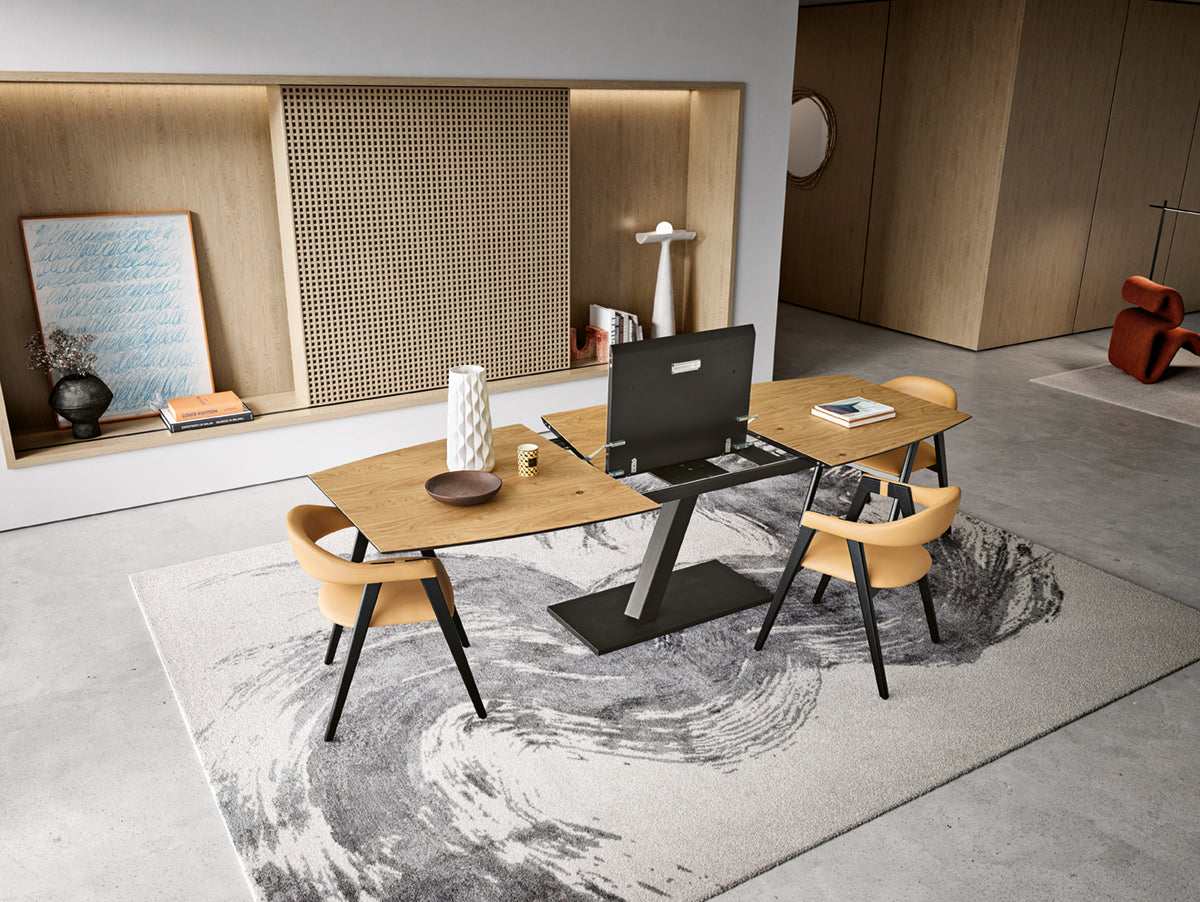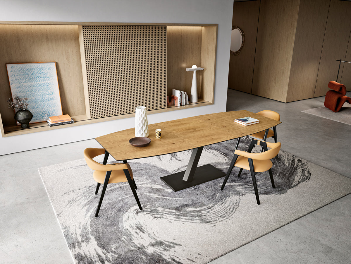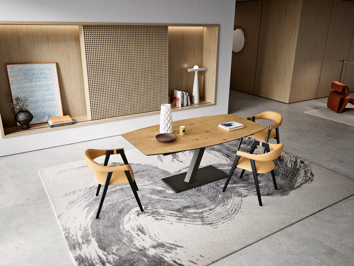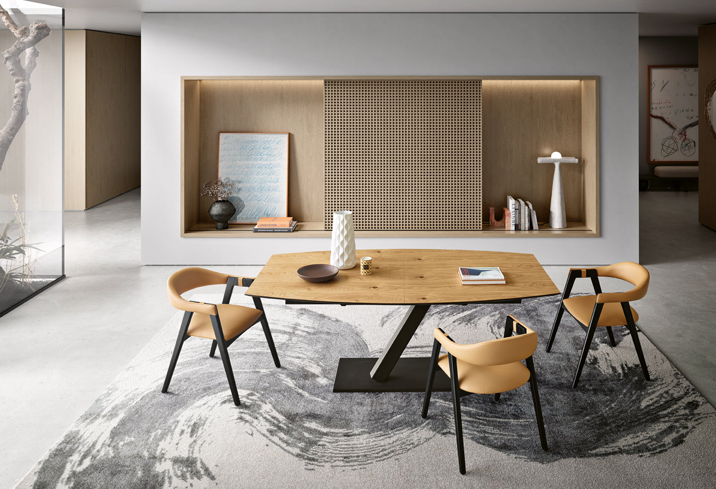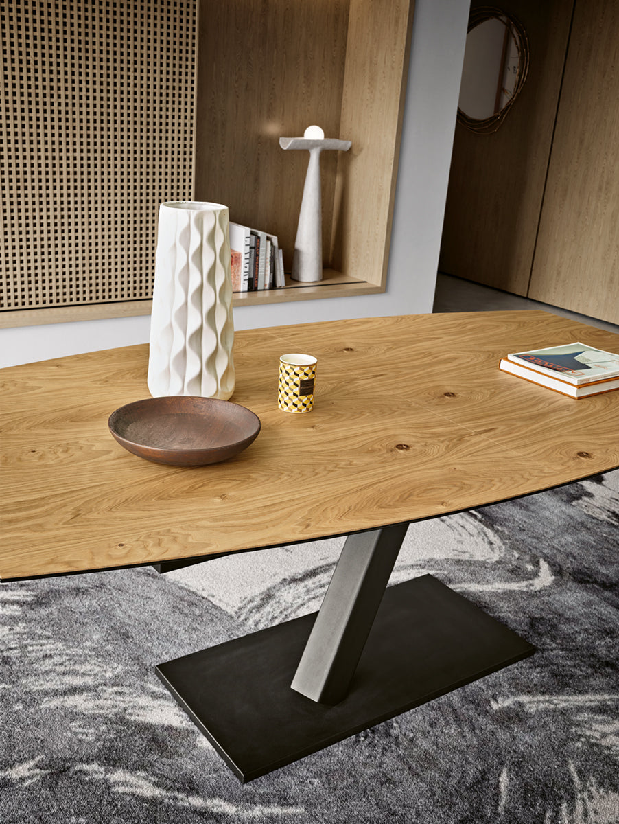 Equipe a sua sala de jantar com esta mesa oval extensível, para ter espaço suficiente para si e para os seus amigos e familiares. O tampo está Lacado com capa de Carvalho e em pé de Ferro, este tampo é extensível.