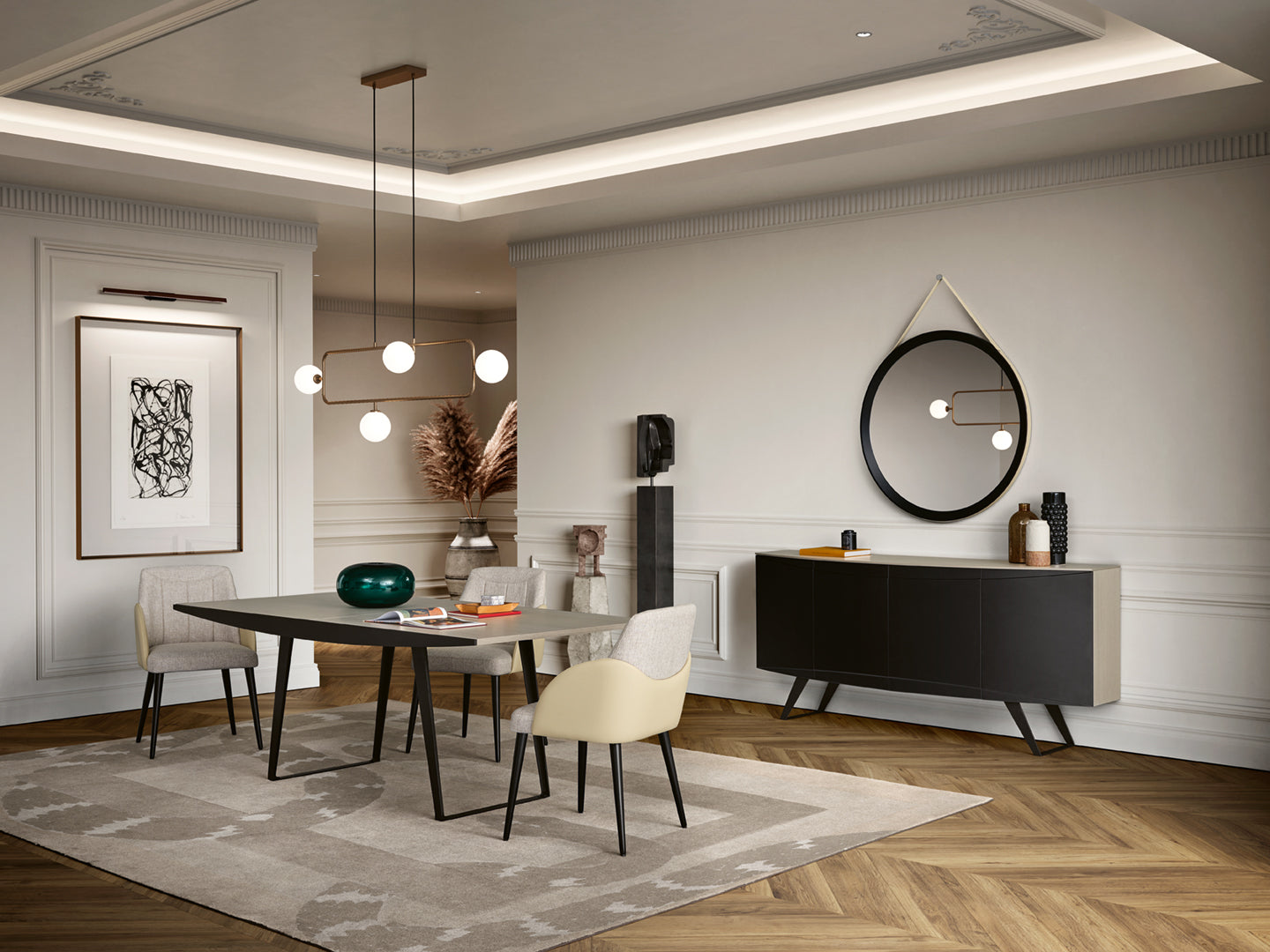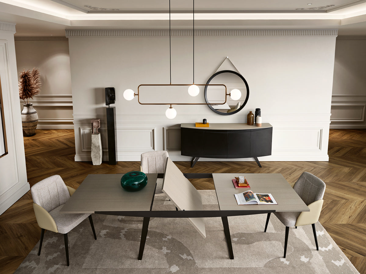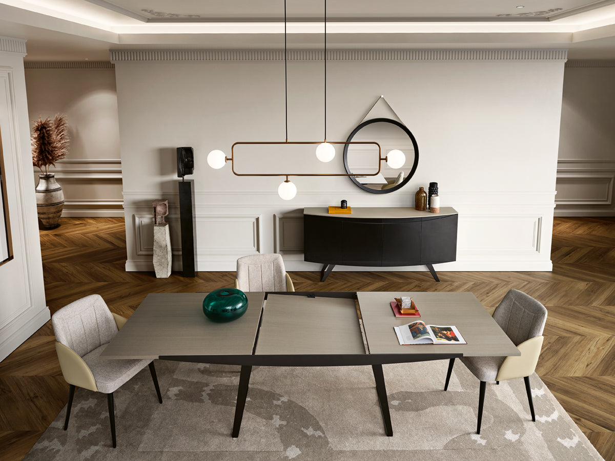 Mesa de Jantar extensível reta em Carvalho e estrutura e pé em Ferro. Um design minimalista, ideal para uma sala de jantar versátil, sempre pronta para receber aqueles que mais gosta para momentos de partilha à volta da mesa.