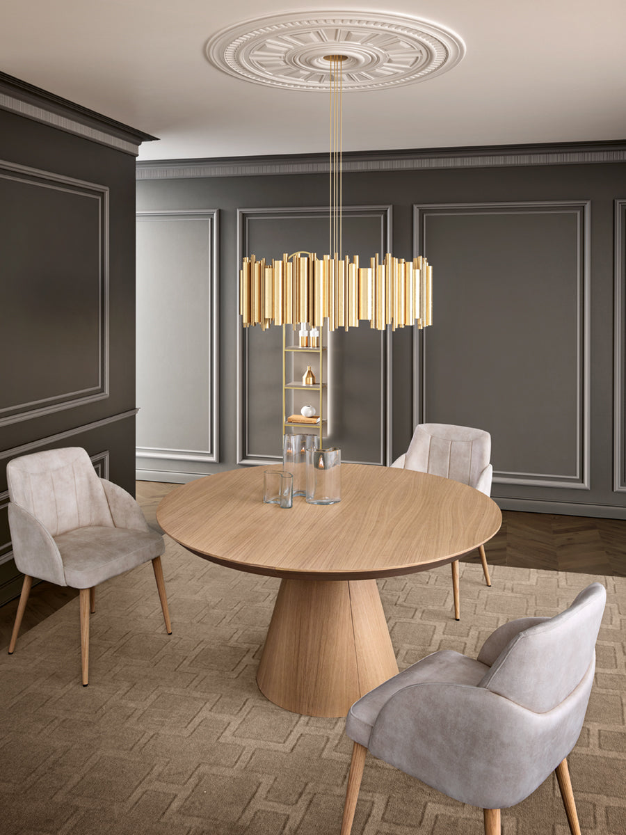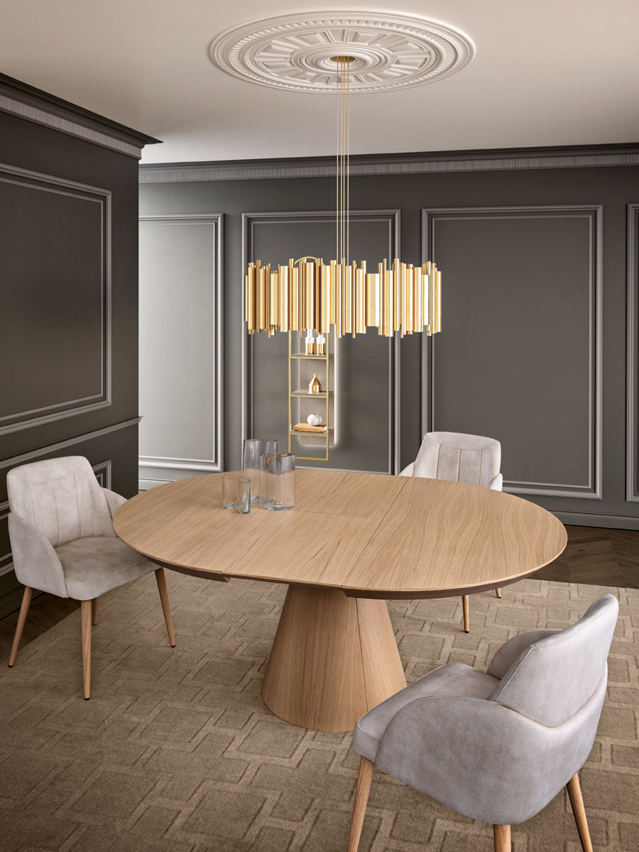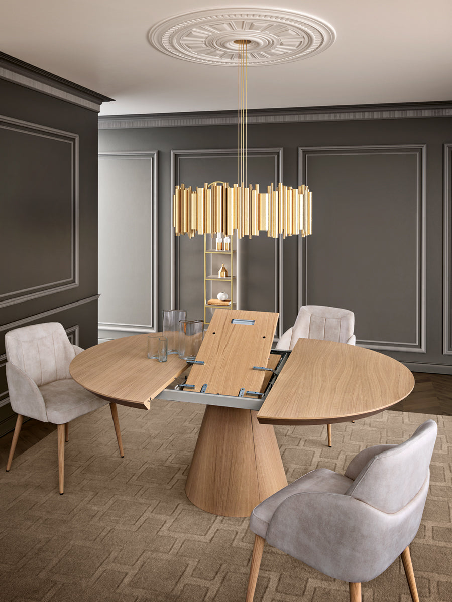 Funcionalidade e design combinam com esta mesa de linhas perfeitas. Mesa de Jantar redonda extensível toda em Carvalho e pé em Cone.
