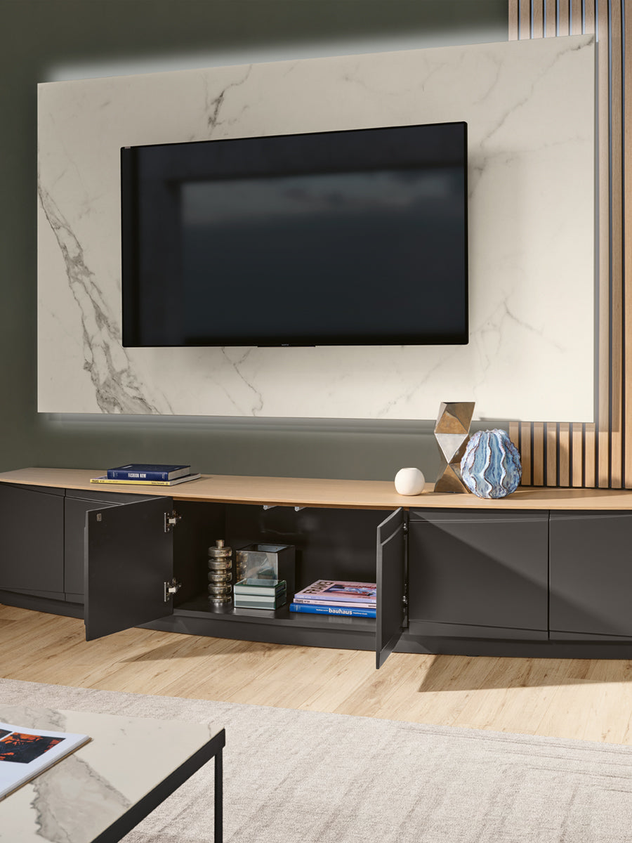 Móvel TV CORVO que combina funcionalidade e cores clássicas num design moderno. Este móvel combina com um painel TV Lacado Mate com cerâmica, iluminado e com fita de LED oculta. Também um painel Ripado com costa Lacado Mate e ripas de Carvalho. E por fim, o móvel em Carvalho com interior e as 6 portas em Lacado Mate em Soco Lacado Mate.