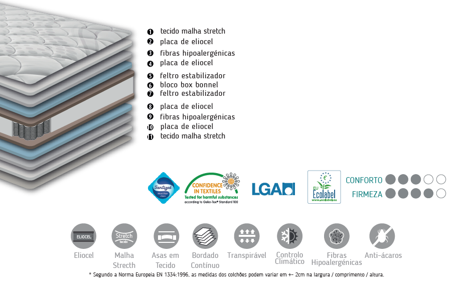 Bloco formado por molas de aço, cujo perímetro da estrutura é completamen-te revestido por um perifé-rico de eliocell de alta densidade, criando uma superfície total de descan-so e firmeza.