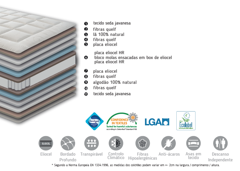 Material leve, confortável e macio, natural e hipoaler-génico, com elevada capacidade de absorção de humidade