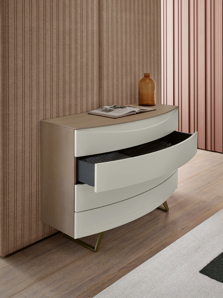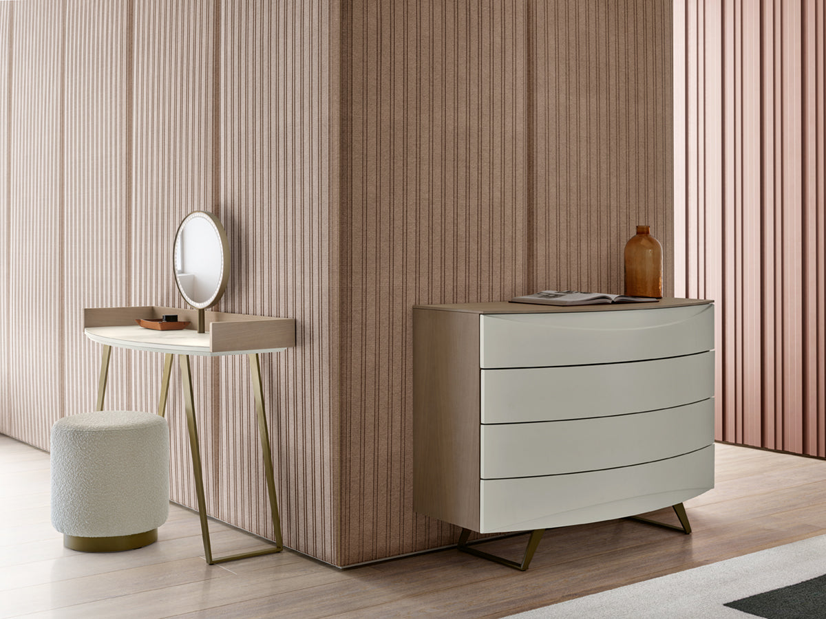 Cómoda em Carvalho e gavetões em Lacado Mate e pé em ferro. Contém 4 gavetões para arrumação e ideal para completar a decoração do seu quarto.