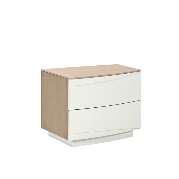Mesa de cabeceira em Carvalho com gavetas e soco lacado. Possui 2 gavetas para a arrumação que pretende, ideal para completar a decoração do seu quarto.