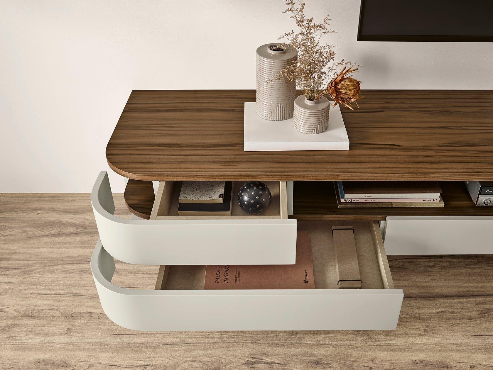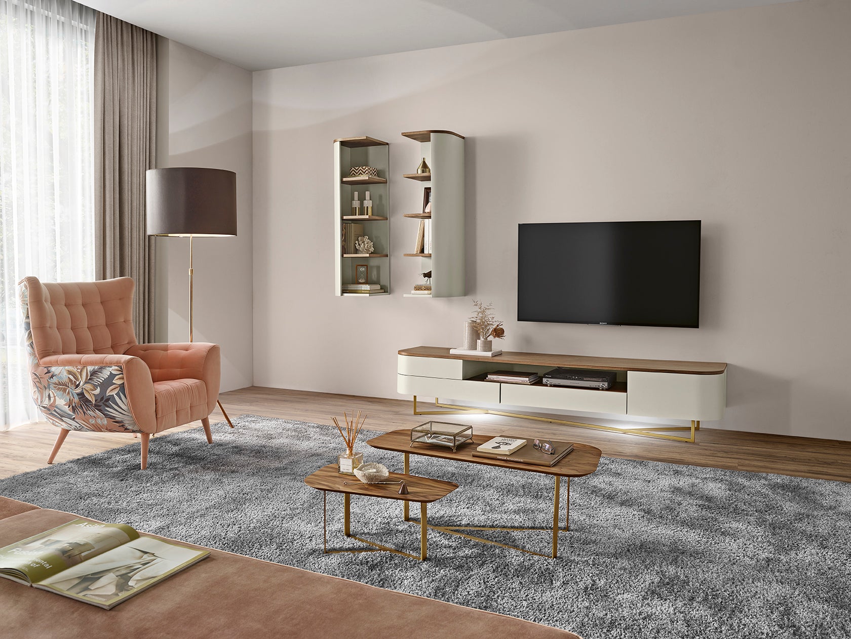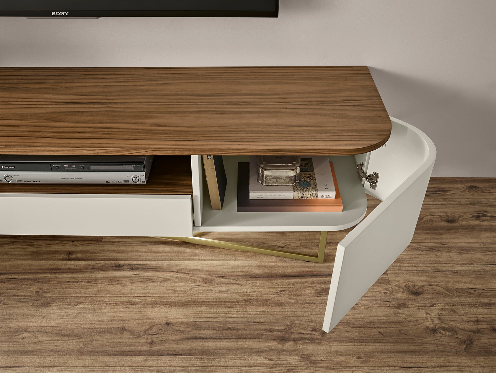 Móvel de TV com pé de ferro e várias divisões. Design elegante e moderno, o móvel certo para a sua sala de estar.
