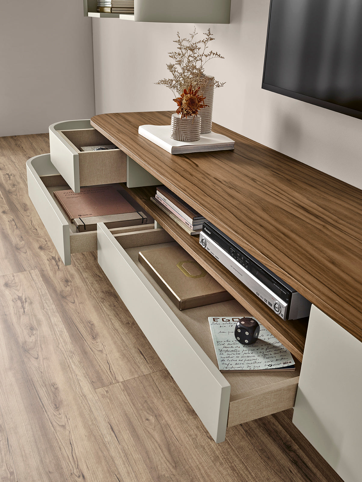 Lacado Mate (LM20) e o tampo mais as prateleiras em folha de Nogueira (NG).