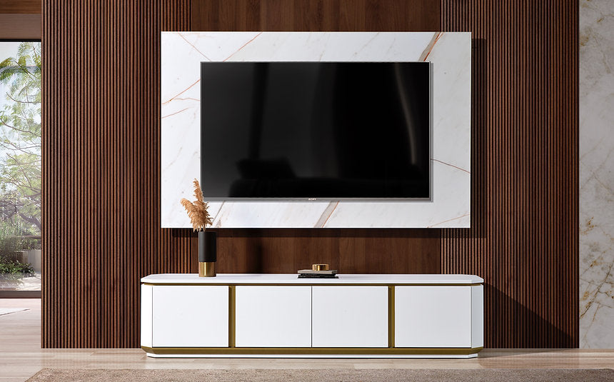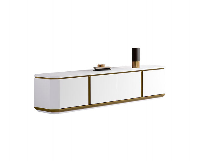 Móvel TV com um design elegante e intemporal vai tornar-se a melhor peça de mobiliário, útil e decorativo numa sala de estar moderna. Móvel em Lacado Mate Branco e Lacado Mate Dourado com 4 portas.