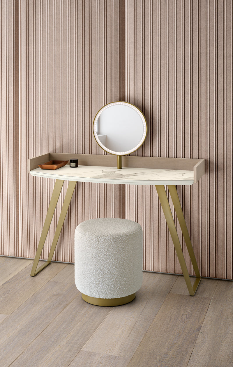 Tocador com espelho incorporado e com uma fita LED. Tampo em Lacado e cerâmica. Seja a maquilhar-se, seja a arranjar o cabelo, o seu dia começará cheio de elegância e requinte.