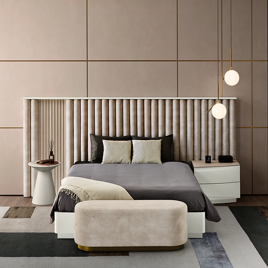 Banqueta estofada e com acabamento em Lacado. Um complemento de suavidade e conforto para a decoração de qualquer quarto.